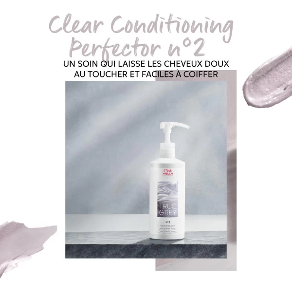 Les cheveux naturellement blancs ou poivre et sel ont besoin de soins lĂ©gers, qui les rendent plus disciplinĂ©s et faciles Ă coiffer. Le conditionneur Clear Conditioning Perfector True Grey n° 2 est un soin lĂ©ger, qui rend les cheveux faciles Ă coiffer, sans parfum ni agents alcalins comme l’ammoniaque et la MEA. Sa mission ? Revitaliser les cheveux naturellement blancs ou poivre et sel tout en respectant la structure naturelle de la fibre capillaire. Il s’utilise de 3 façons : en soin après un service Silver Glow, pour diluer une nuance ou en mĂ©lange lors de l’Ă©tape 1 du service Silver Glow Express.